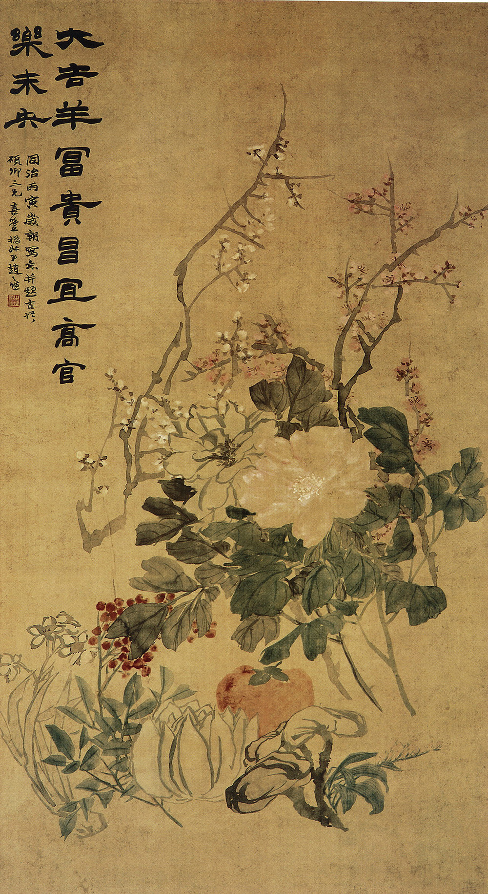 款识:大吉羊富贵昌宜高官乐未央,同治丙寅(1866年)岁朝写意并题吉语,硕卿三兄囗鉴,撝叔弟赵之谦。