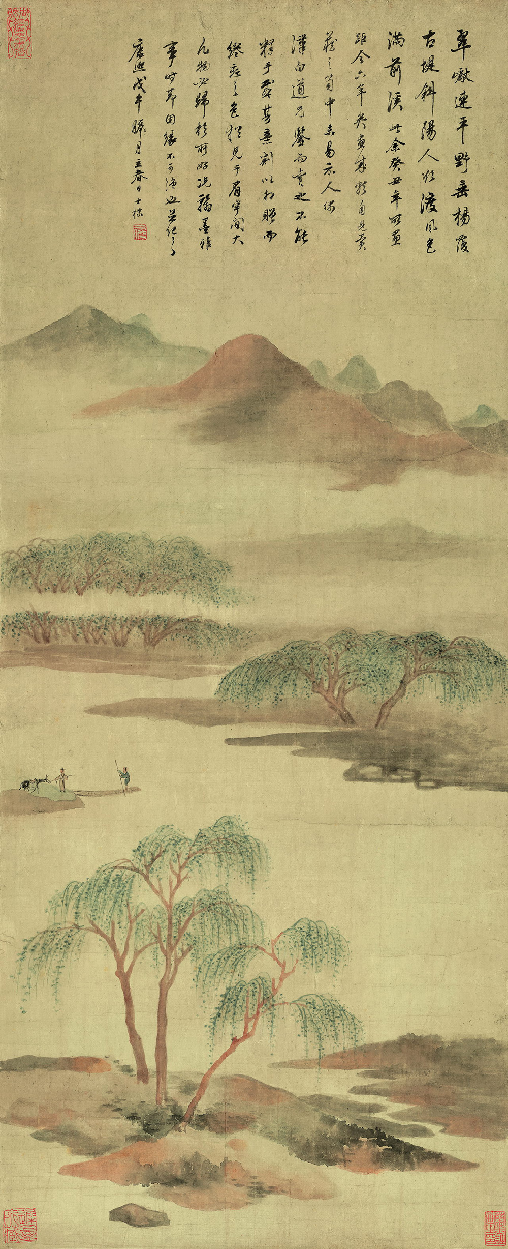 款识:翠巘连平野,垂杨(柳)覆古堤。斜阳人欲渡,风色满前溪。”“此余癸丑年所画,距今六年矣,画成颇自见赏,藏之箧中,未易示人。偶汉白道兄鉴而赏之,不能释手,感其意割以相赠,而绻恋之色犹见于眉宇间。大凡物必归于所好,况翰墨雅事,时节因缘不可强也,并记之。康熙戊午(1678年)腊月立春日。士标。
