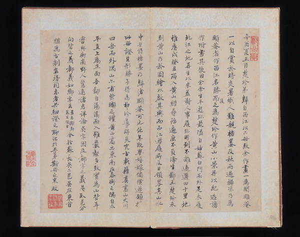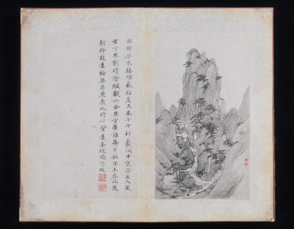 绘黄山景色八幅及首尾题款二幅,共十幅。画册右侧绘图,左侧文字说明,山峰陡峭奇俊,松柏伸展迎客,画面清爽利落。