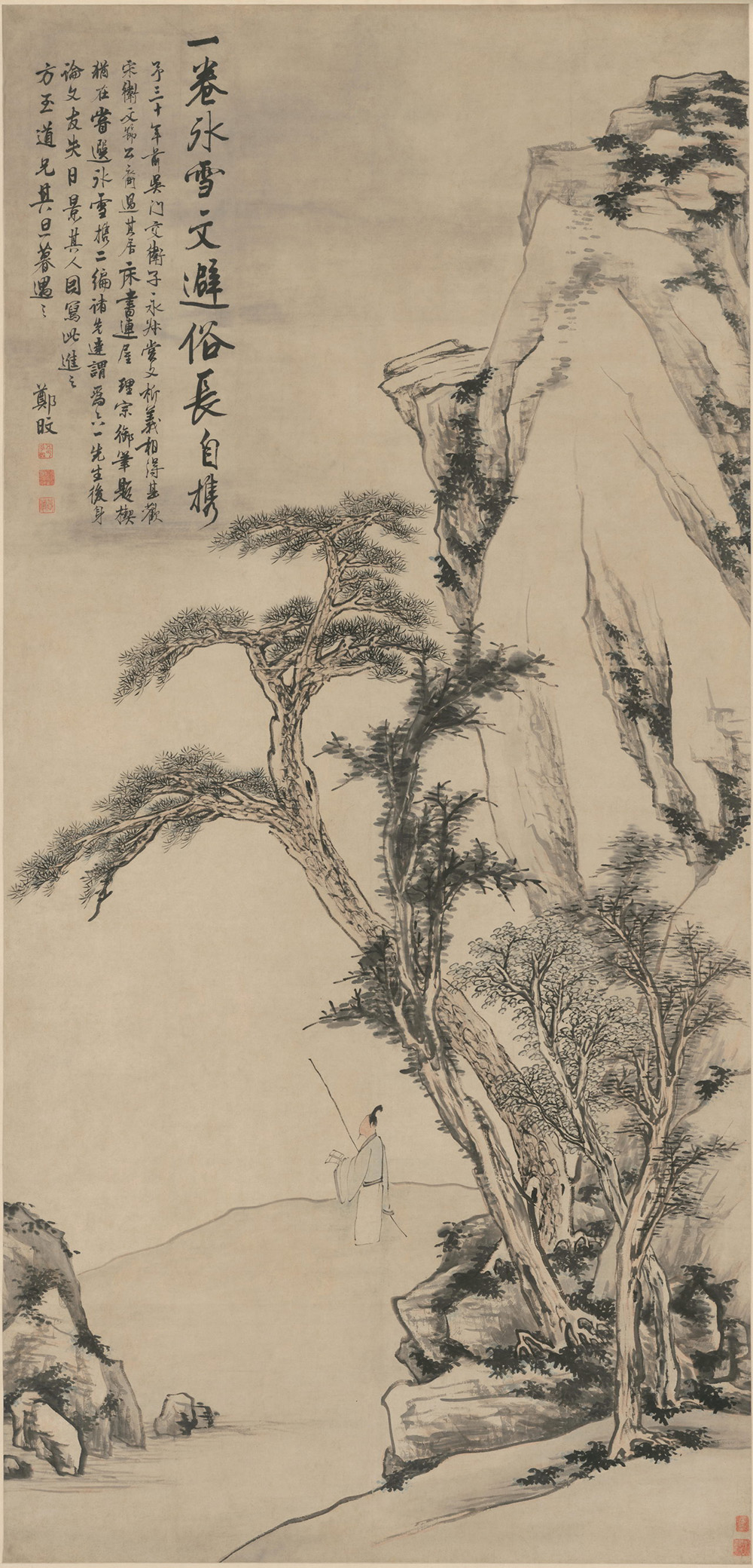 本绘画一棵奇松从左下角向右上倾斜探出,占据中间主要画面,三棵秋树相互掩映,丰富画面且从视觉上平衡了倾斜的松树树干。后侧峭立高耸的山峰更衬托苍松的挺拔。左下角的岩石小景与松树构建出一方留白,一个高士右手持杖,左手握书立于松下,郎朗吟诗声不绝于耳。画风承继弘仁一脉,萧散清寂,山石轮廓线与皴法意趣更近黄公望;枯笔皴擦,简而深厚,设色淡雅,一派清浚疏朗的本家面貌。