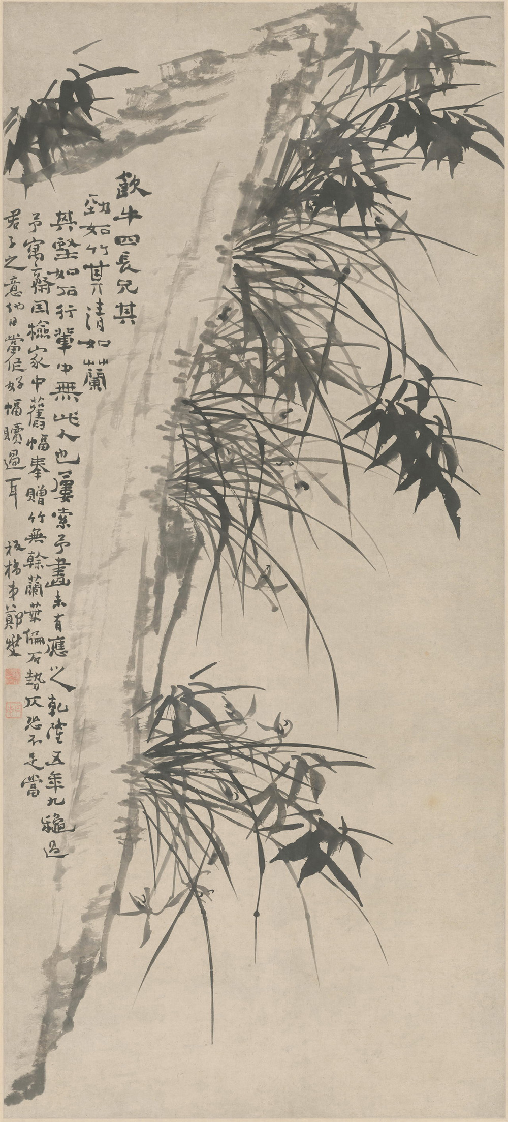 画上自题:“饮牛四长兄其劲如竹,其清如兰,其坚如石,行辈中无此人也。屡索予画,未有应之。乾隆五年九秋过予寓斋,因检家中旧幅奉赠。竹无竿,兰叶偏,石势仄,恐不足当君子之意,他日当作好幅赎过耳。板桥弟郑燮。”钤“郑燮印”、“克柔”印。