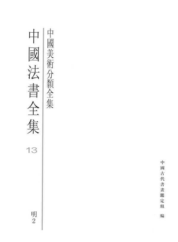 《中国法书全集》是《中国美术分类全集》系统工程的子工程。共分18卷,计先秦两汉一卷、魏晋南北朝一卷、隋唐五代三卷、宋代三卷、元代三卷、明代四卷、清代三卷,共收作品1849件。
