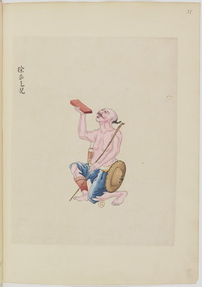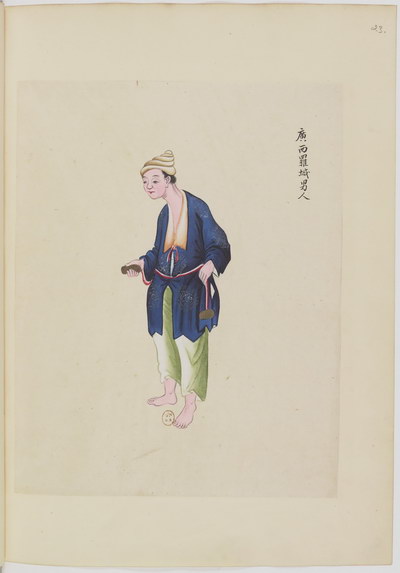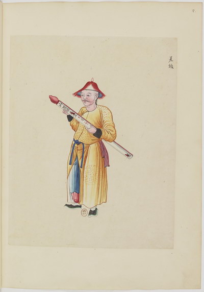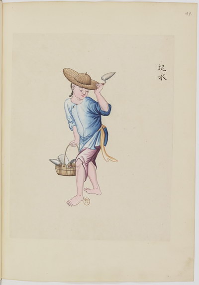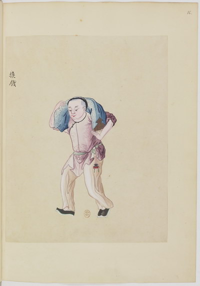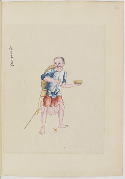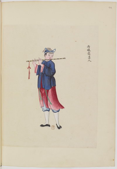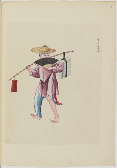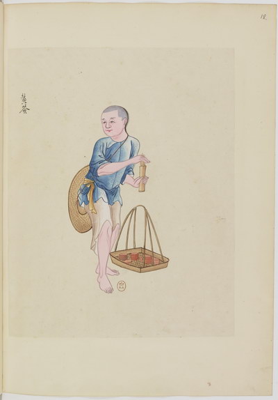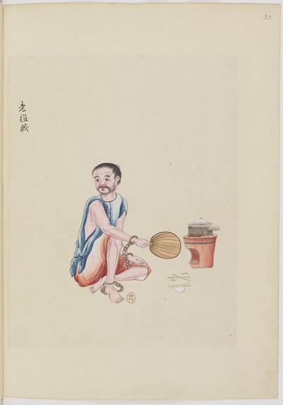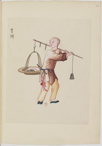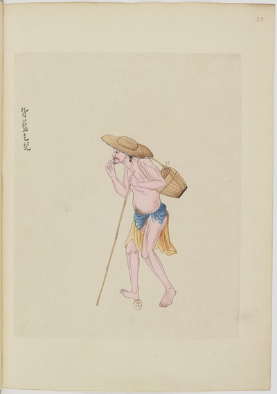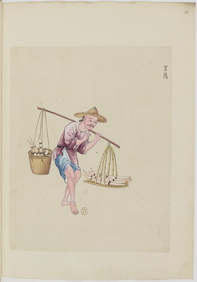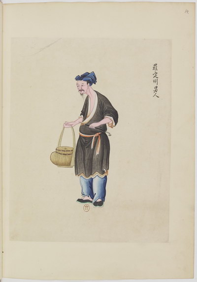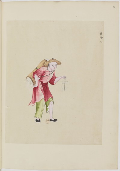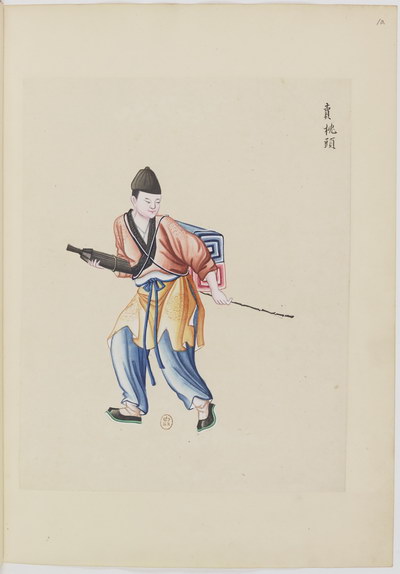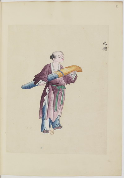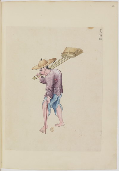 外销画,含插图六十九幅,画册描绘了一些街头行业角色、民族人物服饰以及一些摆件器物等,部分页面有中文标注。Costumes Chinois.Marchands et Gens du Peuple et quelques autres.Instruments.vases et meubles