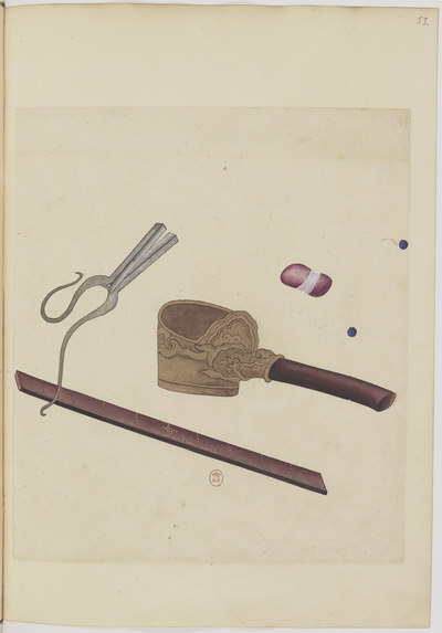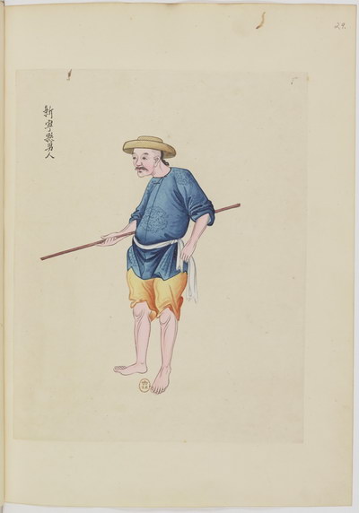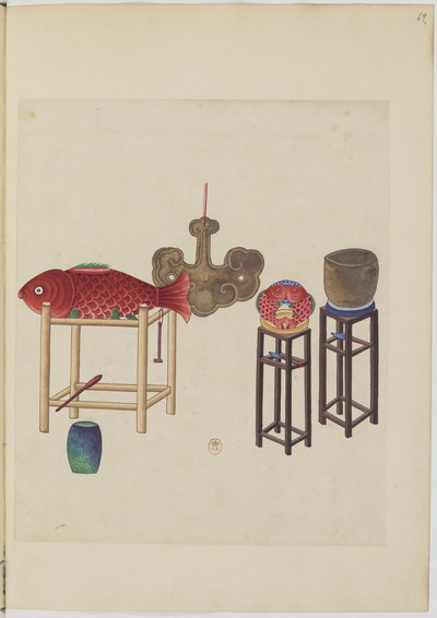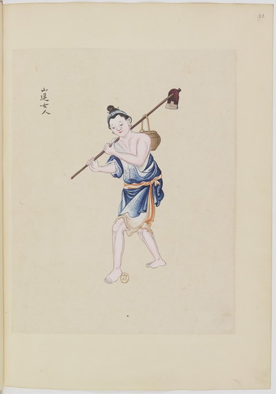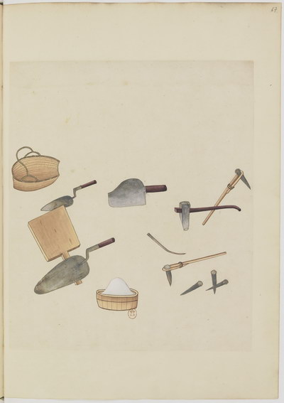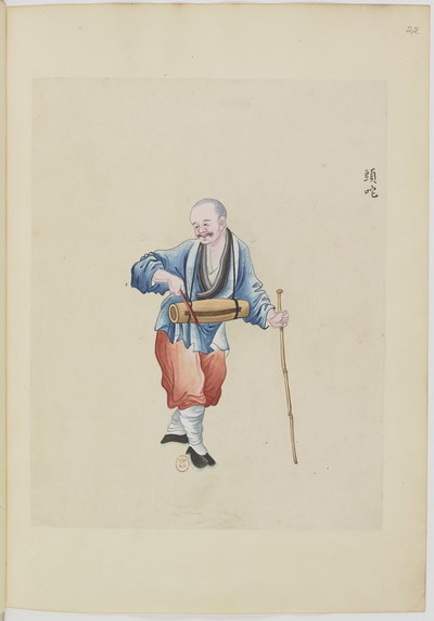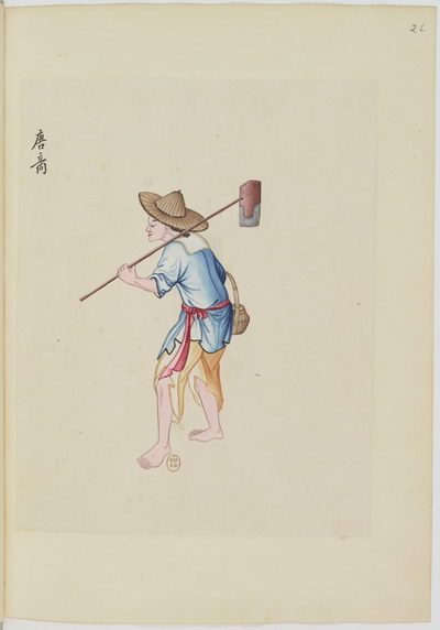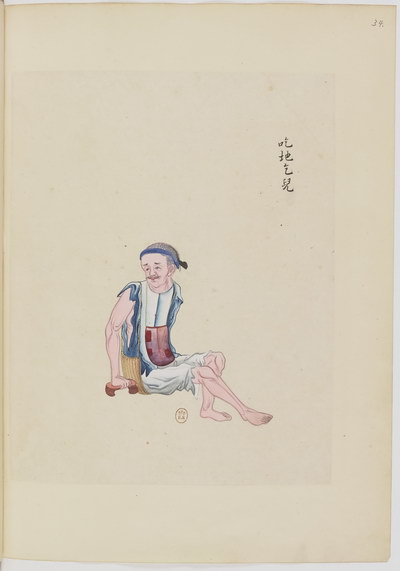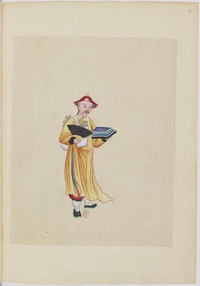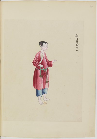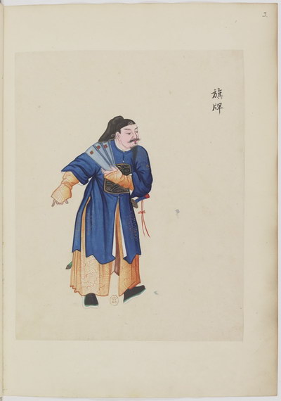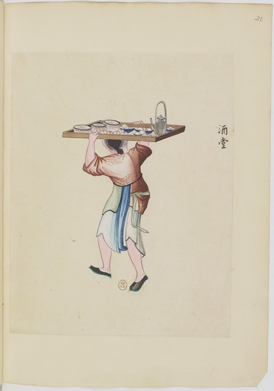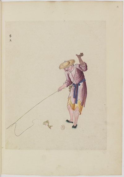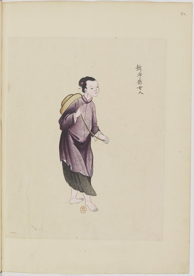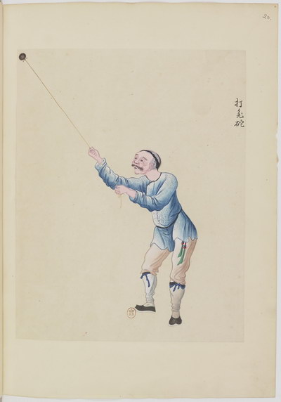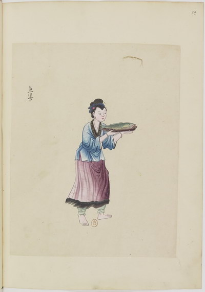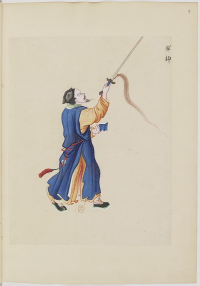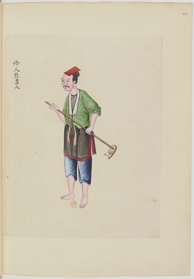 外销画,含插图六十九幅,画册描绘了一些街头行业角色、民族人物服饰以及一些摆件器物等,部分页面有中文标注。Costumes Chinois.Marchands et Gens du Peuple et quelques autres.Instruments.vases et meubles