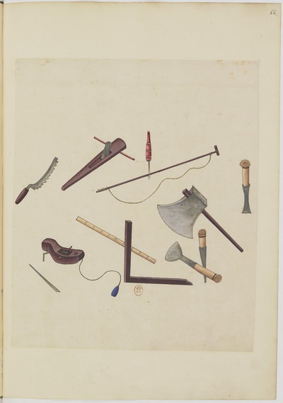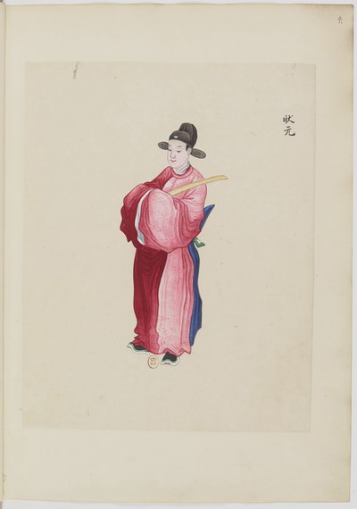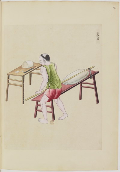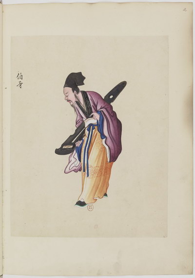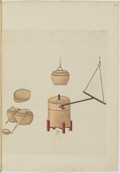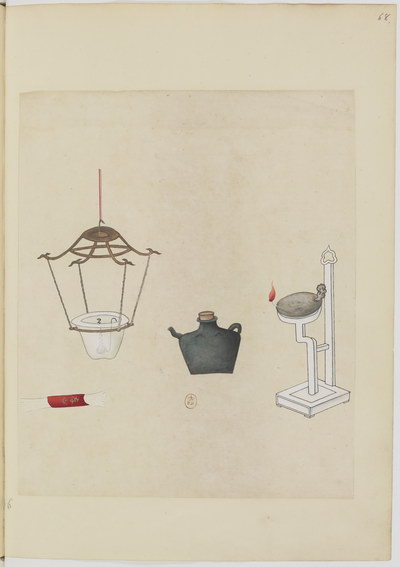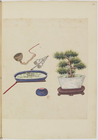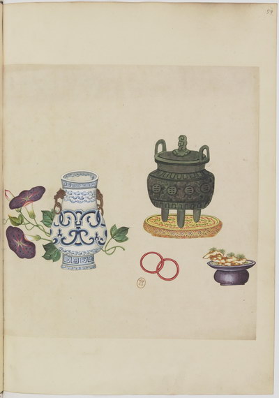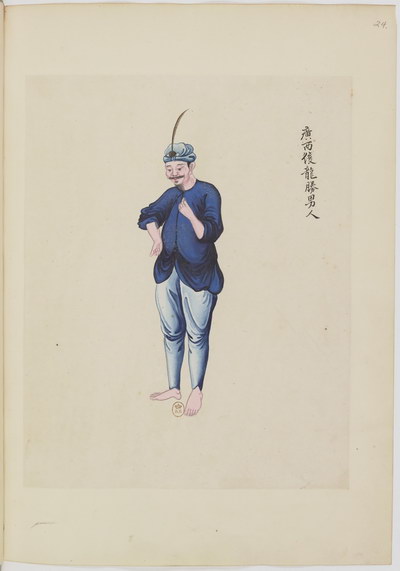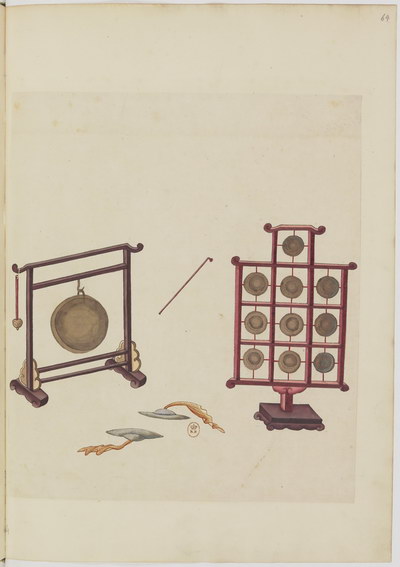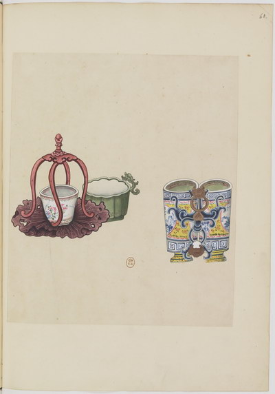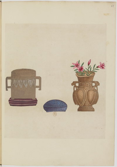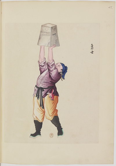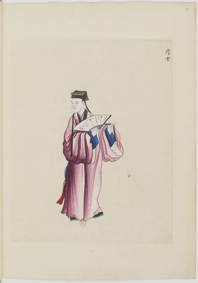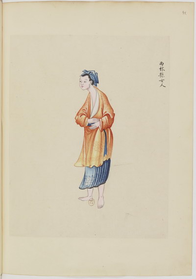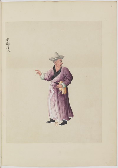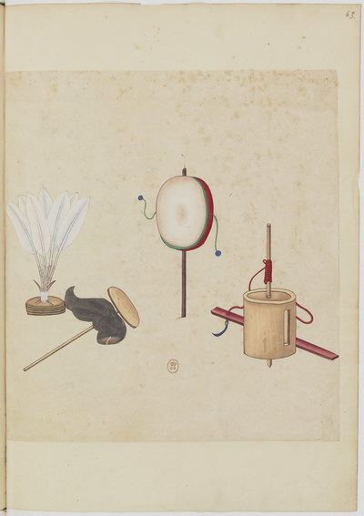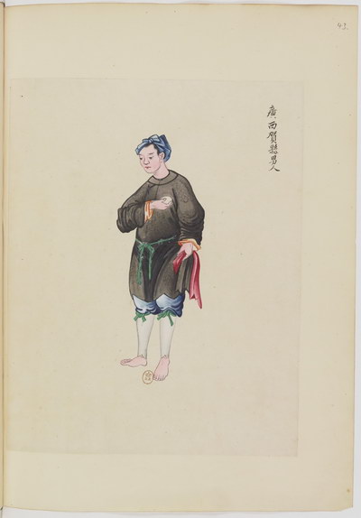 外销画,含插图六十九幅,画册描绘了一些街头行业角色、民族人物服饰以及一些摆件器物等,部分页面有中文标注。Costumes Chinois.Marchands et Gens du Peuple et quelques autres.Instruments.vases et meubles