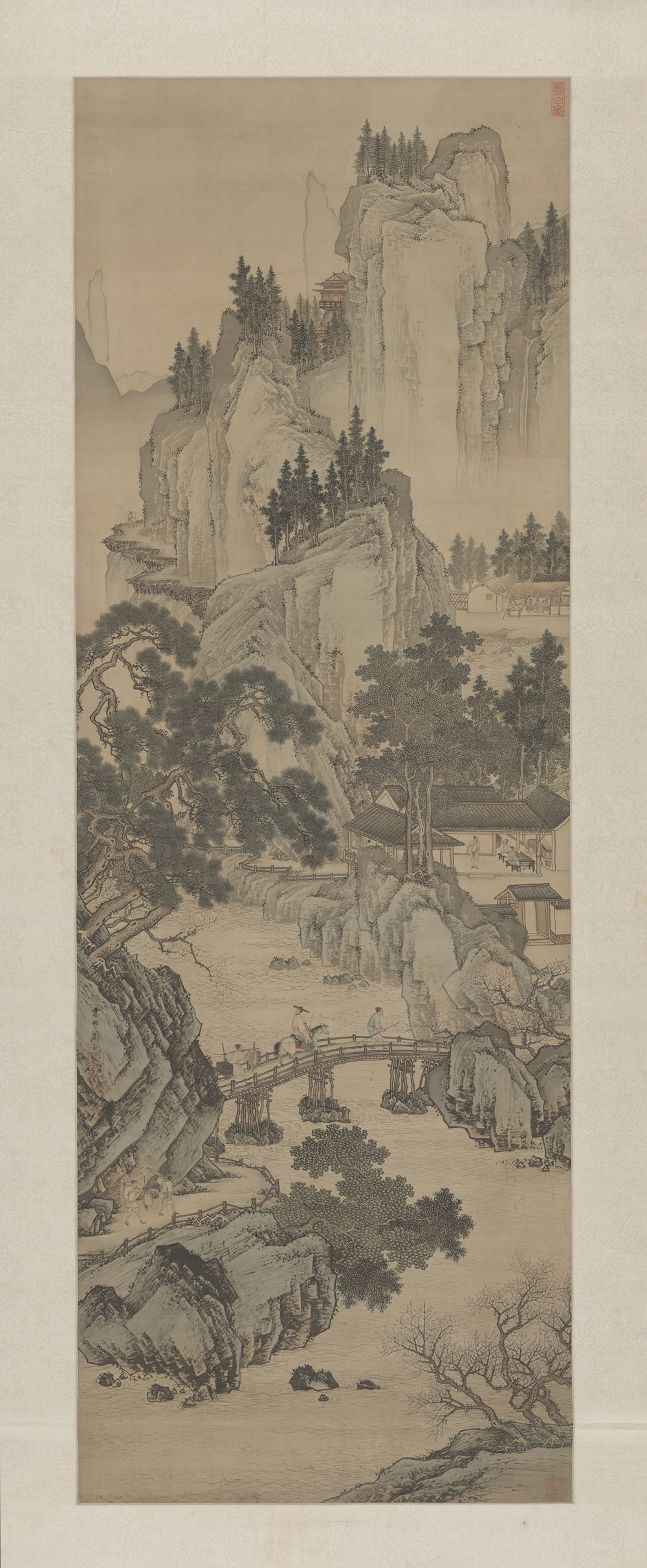 此图以传统的春山行旅为题材,描绘高山石崖险峻陡峭,楼阁房舍掩映其间,错落有致。近景山溪岸边春花几树,山溪湍流,小桥流水,主仆一行三人正在过桥。山上苍松浓郁,遒劲多姿。舍后绿树成荫,一派春机昂然的景象。画家在全景式的构图中突出前景,着意表现春山、游骑、桃花、虬松,以此点明题意。