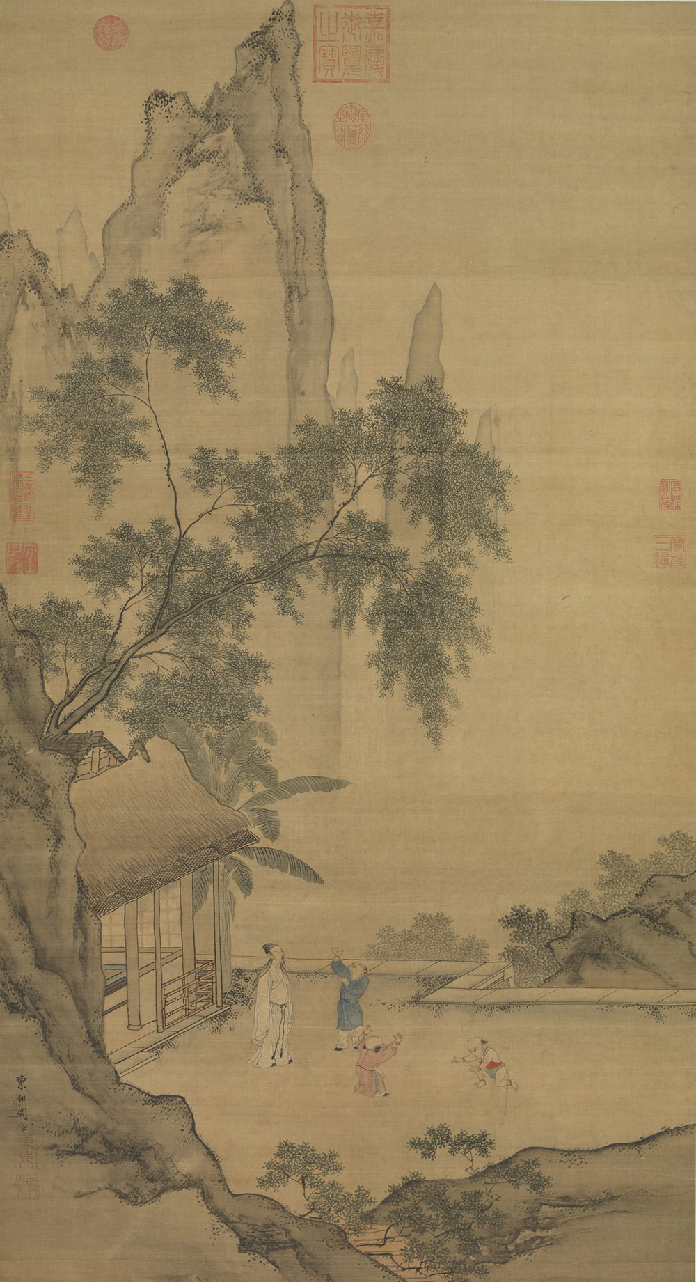 柳荫庭院,三名童子于春风中捉花絮,一翁服巾,闲立旁观。画题系出自白居易 〈别柳枝〉:“谁能更学孩童戏,寻逐春风捉柳花。” 与杨万里的 〈闲居初夏午睡起〉:“日常睡起无情思,闲看儿童捉柳花。” 画幅构图采边角式,虽与浙派同样传承自马、夏传统,但却了无浙派刚劲的笔调,处处洋溢著南宋院体绘画抒情的风致。