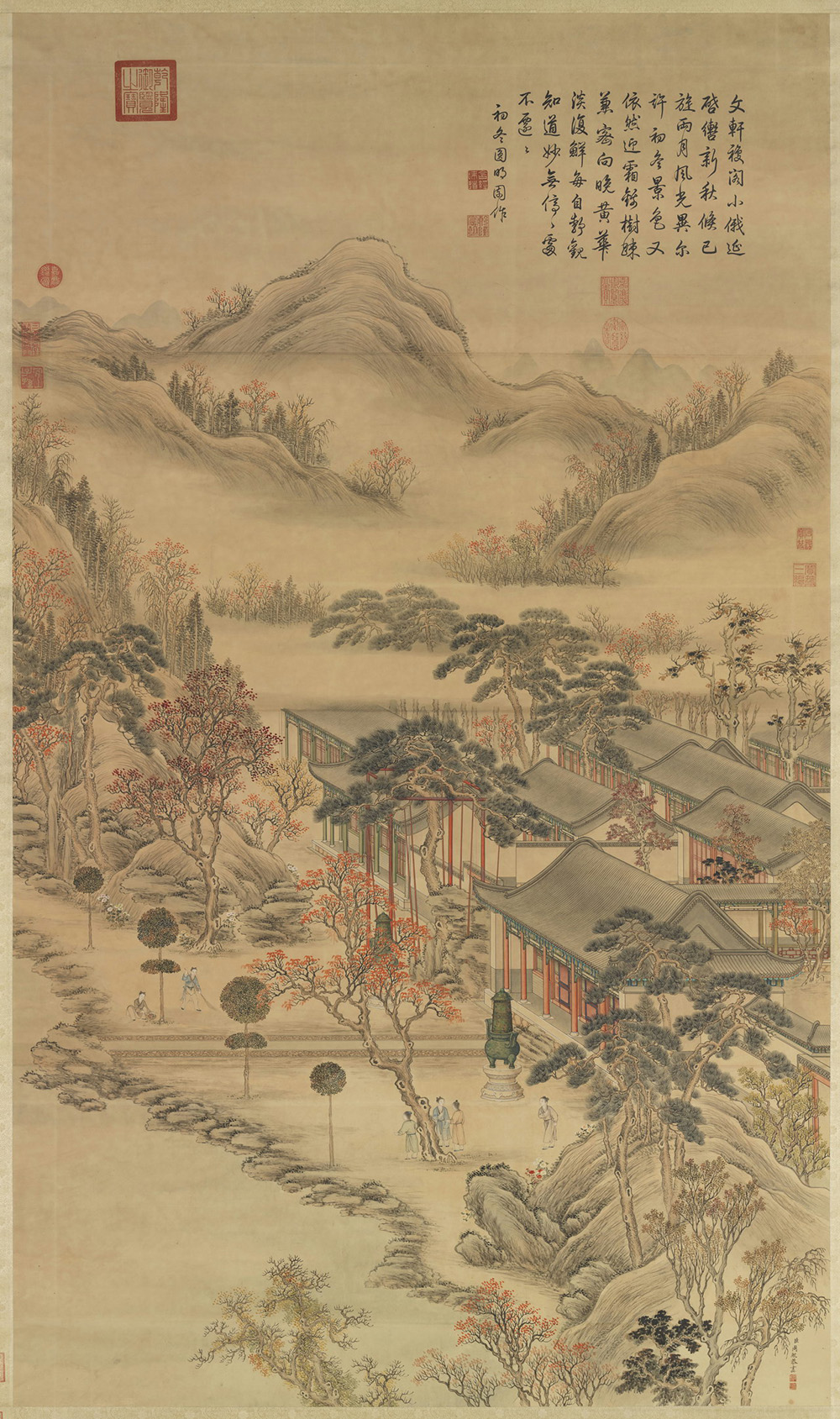 清高宗题跋:文軒複閣小俄延。啟轡新秋倏已旋。兩月風光異爾許。初冬景色又依然。迎霜錦樹疏兼密。向晚黃華淡復鮮。每自靜觀知道妙。無停停處不遷遷。初冬圓明園作。