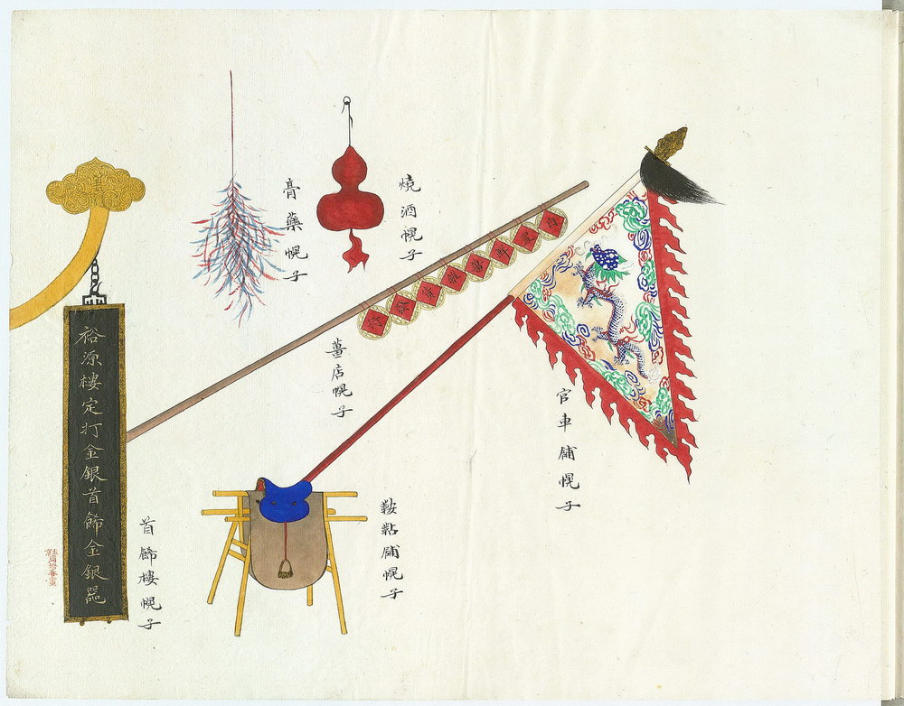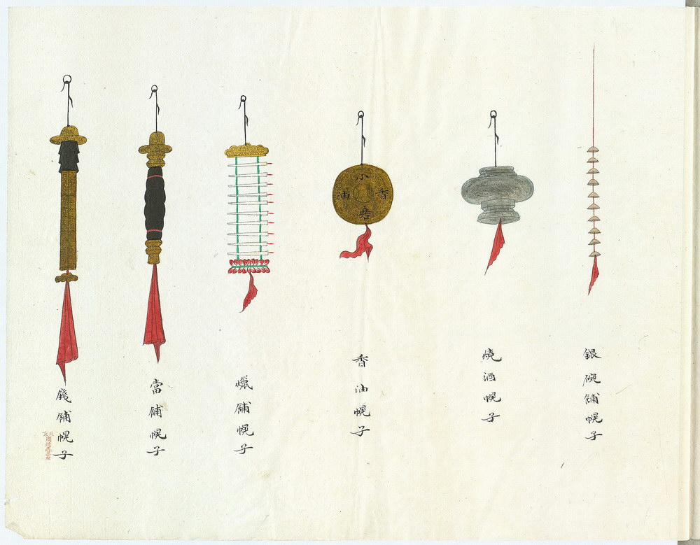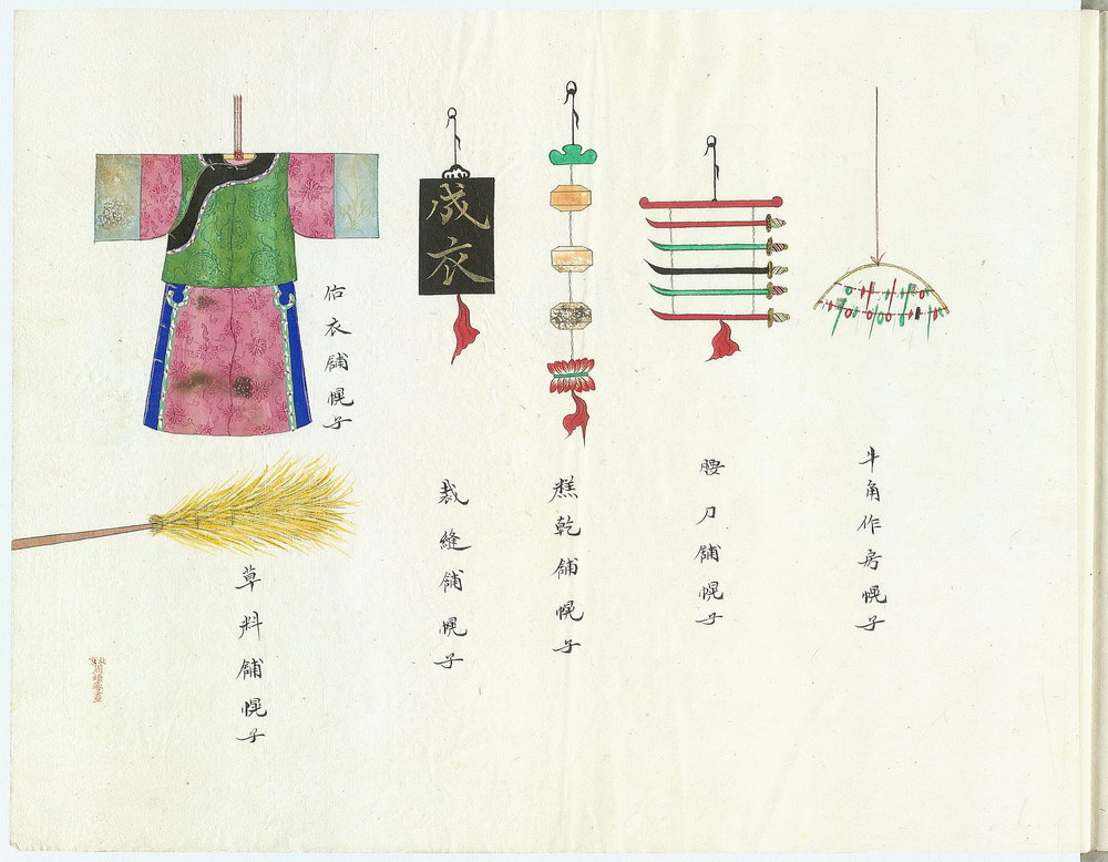 此套京城店铺幌子图绘共 18 幅(近 100 种,如:当铺、酒铺、药谱、首饰铺、点心铺,甚至还有奶茶铺、影像铺等等)。画作帮助我们了解清代北京的市景风俗习惯。