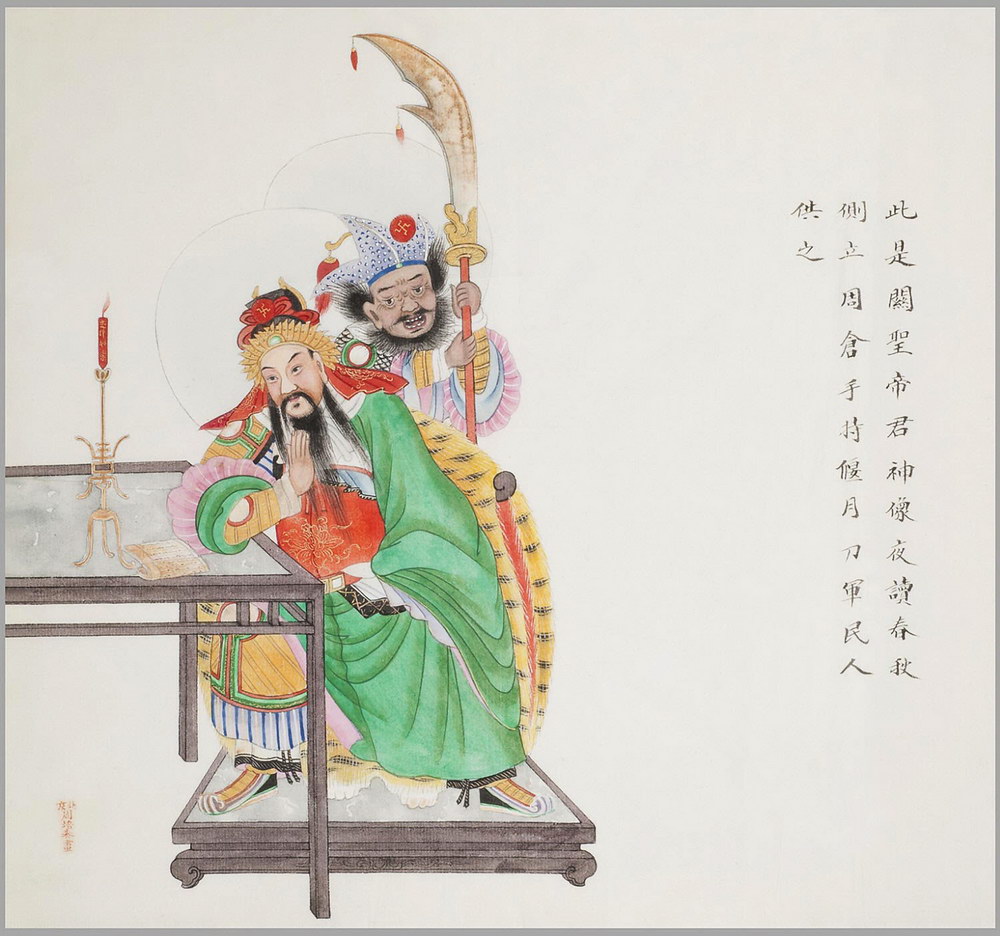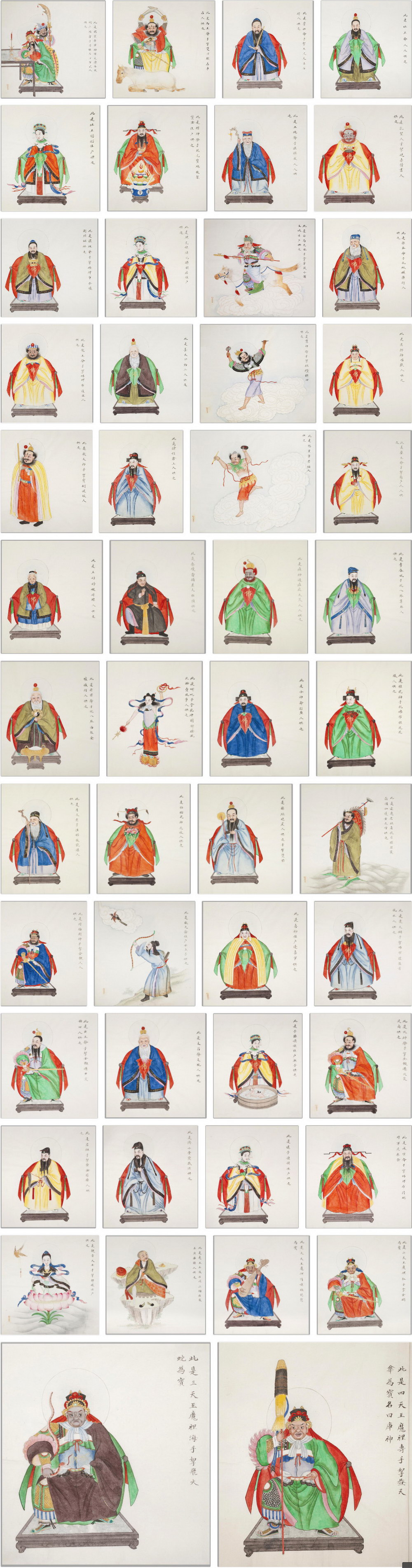 《民间神像图》(Album Paintings of Household Gods)描绘清末中国民间信仰的了五十种常见神像图,包括:关圣帝君、马王爷、鲁班爷、灶王爷、灶王奶奶、财神爷、土地爷、孔圣人、罗祖爷、眼光娘娘、白马先风、药盛爷、龙王爷、姜太公、雷神爷、老郎神、张天师、韩信、魁星、药王爷、王奶奶、秦琼、瘟神、李春(淳)风、老君爷、哪吒、小神爷、桂花神、月及老、石榴花神、孙膑、达魔老祖、增福财神、张先爷、喜神、袁天钢(罡)、虫王爷、文昌爷、子孙娘娘、火神爷、吕祖、济小堂(纪晓堂)、送子娘娘、城隍爷、观音大士、魔王、大天王魔礼清、二天王魔礼红、三天王魔礼海、四天王魔礼寿。图旁有相关介绍说明。