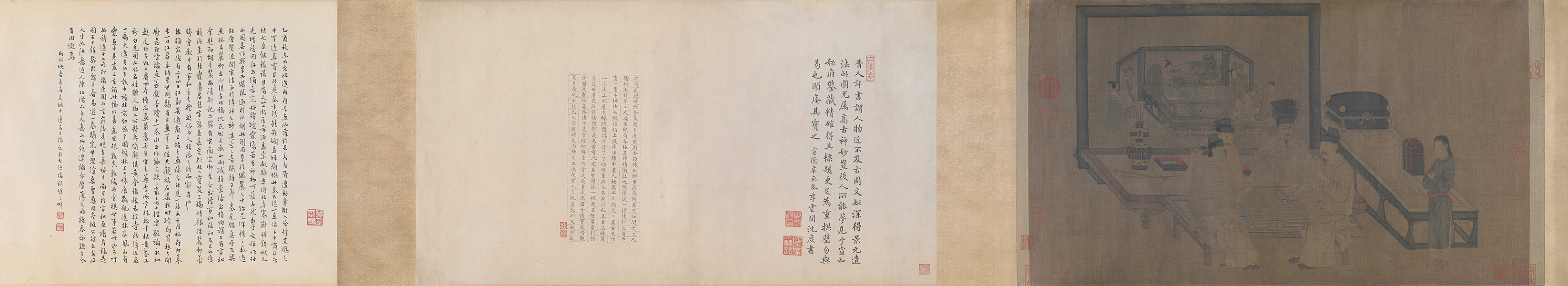 本幅无作者款印。经徐邦达先生鉴定,此系宋人摹本。尾纸除有明代沈度、文徵明的伪款题跋外,还有近人于怀的墨题真迹。钤元柯九思“緼真斋”,清梁清标“棠邨审定”、安岐“安仪周家珍藏”及清内府“乾隆御览之宝”等鉴藏印共16方。其中的“緼真斋”、宋徽宗的“双龙小玺”、“宣和”、“政和”等宋元诸印均伪。