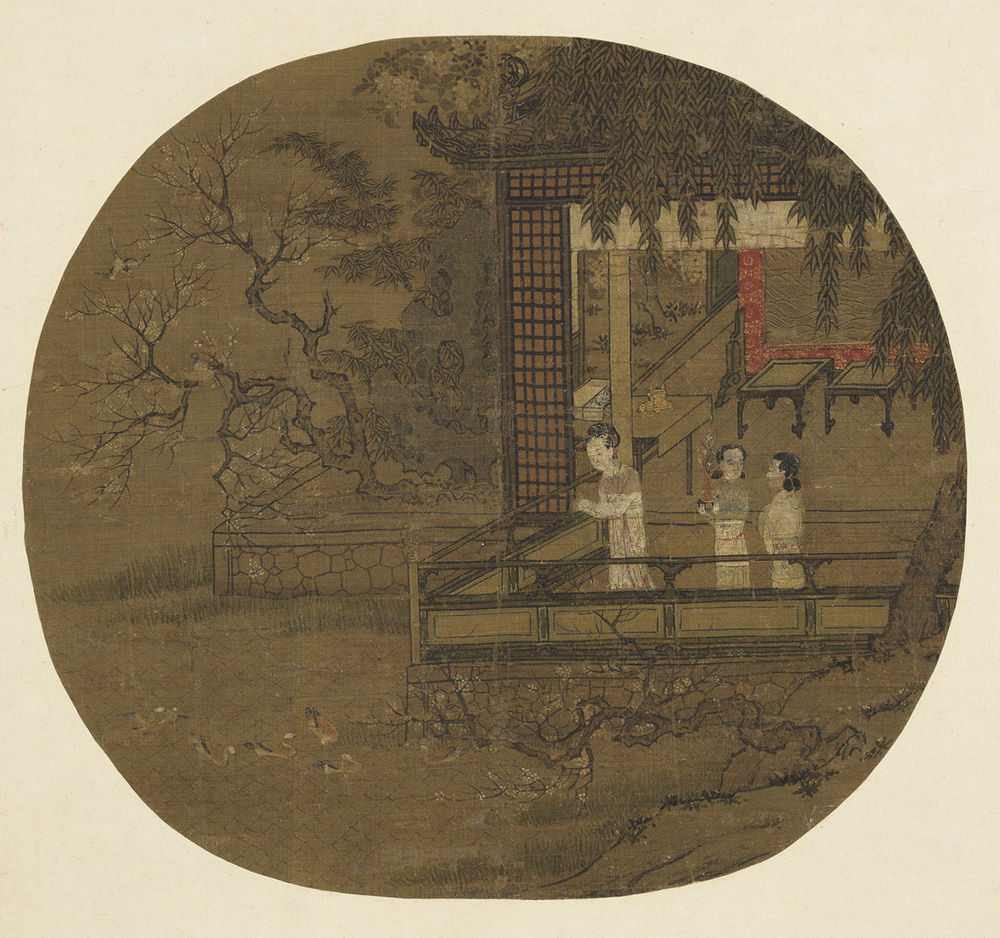 本幅描绘湖水上鸭凫群相嬉戏,富于自然野趣。水榭旁植桃与竹柳,溪河花木掩映的私人堂榭。平台临水边围有栏杆,仕女凭栏眺望入神,画面洋溢著优雅的生活情趣。水榭窗牖开敞,帘幕高卷,室内陈设有水波纹座屏,边缘为红幛描金花是宋代时尚。方凳两张左右并置,座面是棕藤编织物,脚足为如意形。另一侧有一方桌,一面单枨,一面双枨,上覆白巾,置一金铜香炉及书册。