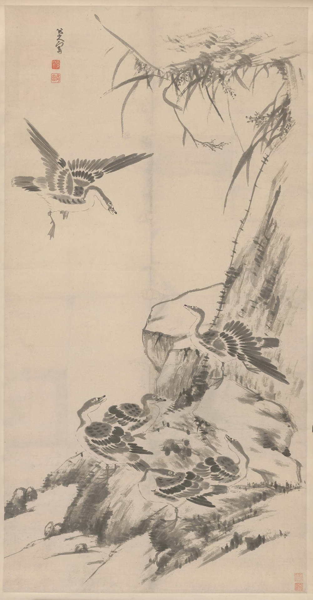 图绘6只芦雁在水际岸边飞、鸣、行、止的瞬间。芦雁的造型准确严谨,动、静的体态表现得出神入化。其背部的羽毛是先以淡墨晕染,趁湿在淡墨上点以浓墨,浓淡墨交融处显现出羽毛柔软细密的质感和厚重的量感。图中描绘山石的笔墨老辣娴熟,石上的青苔以卧笔横锋点染,纵横随意中不失章法,其苔点与芦雁身上的墨点在笔法上形成呼应,令全幅深得酣畅淋漓之趣。