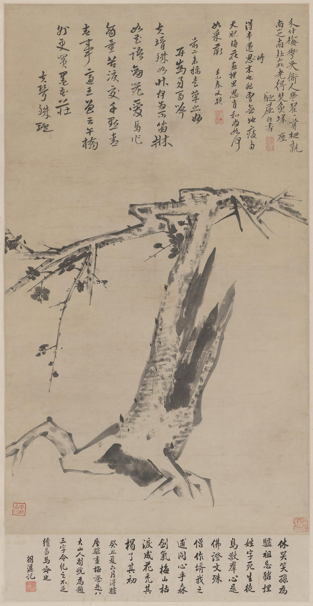 图绘一株古梅树,根部无土,树心中空,旁枝上数朵梅花盛开,显示出顽强的生命力。根据画中的自题诗:“梅花画里思思肖”而知,此图是朱耷仿宋遗民画家郑思肖画兰不着土、以暗示国土为异族人所夺之意的画作,表达了他对明朝的怀念之情。图中用笔苍健有力,线条粗犷,多方硬曲折。施墨枯润结合,富有表现力。此图是朱耷中年时期的代表作。