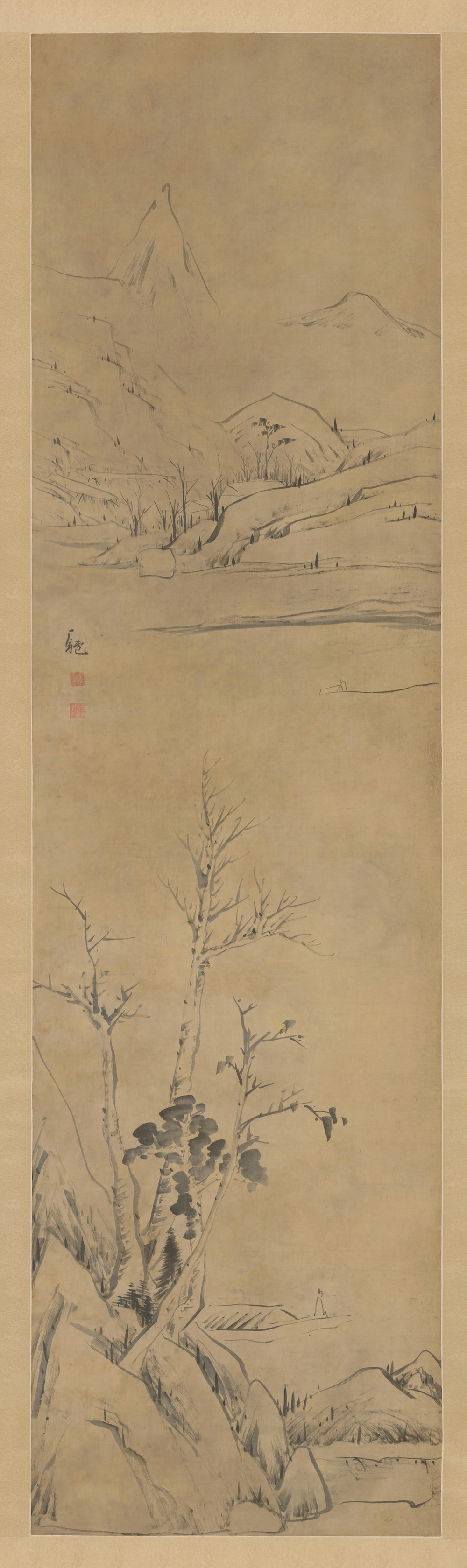 图绘凋零的树木被笼罩在深秋的寒意中,一湖静水之上只见高士孤身垂钓,空旷荒寂的意境中孕含着作者对明朝故土的无限怀念。此图无年款,根据署款“驴”字,推断此幅为朱耷57岁(1682年)左右的作品。