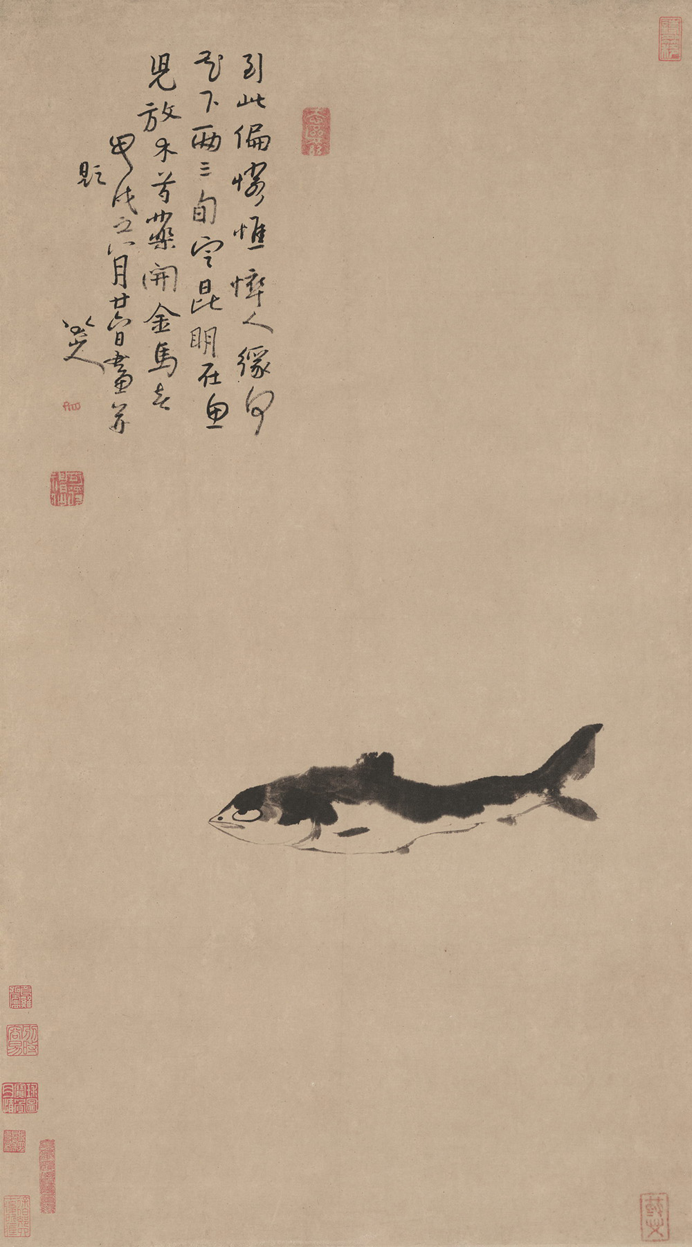 该画题诗:到此偏怜憔悴人,缘何花下两三旬,定昆明在鱼儿放,木芍药开金马春。