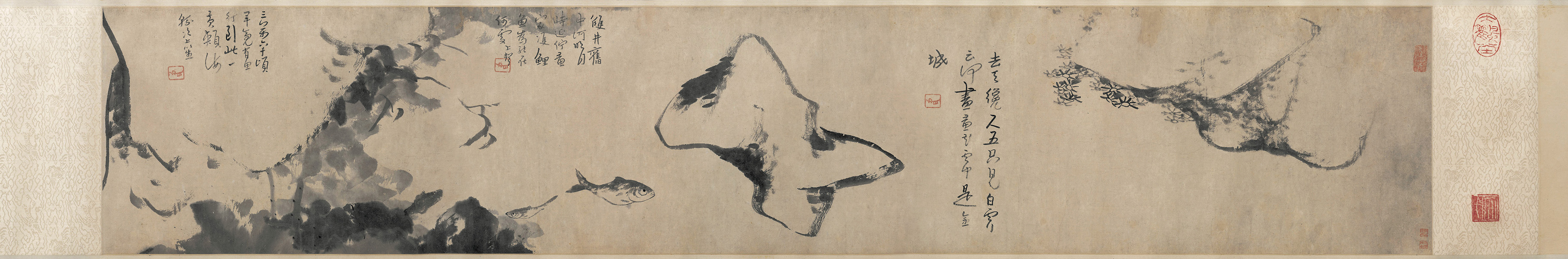 此卷取濠梁观鱼之意,图绘河底景色,左侧绘河草、莲叶一大片,色彩如黛;二只鱼儿游弋其中,向相反方向游去;一块墨石成倾斜状立于河底,形状奇异,一角支立,摇摇欲坠;右侧一大块粗笔绘的墨石从中部凸起。整个画面空旷,了了数笔绘出河底的动静之美。