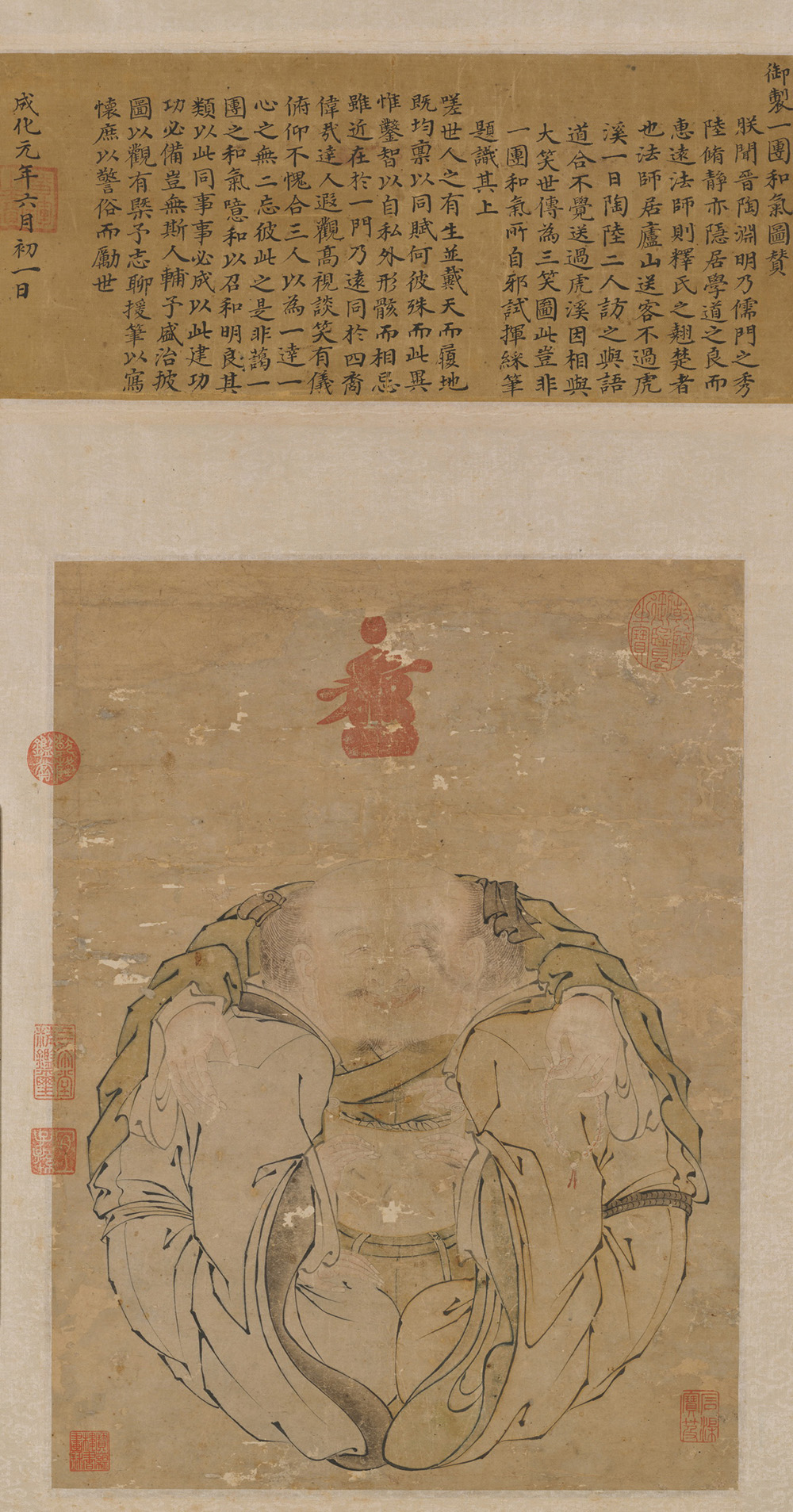 此图作于1465年。粗看似一笑面弥勒盘腿而坐,体态浑圆,细看却是三人合一。左为一着道冠的老者,右为一戴方巾的儒士,二人各执经卷一端,团膝相接,相对微笑,第三人则手搭两人肩上,露出光光的头顶,手捻佛珠,是佛教中人。作品构思绝妙,人物造型诙谐,用图像的形式揭示了儒、释、道“三教合一”的主题思想。