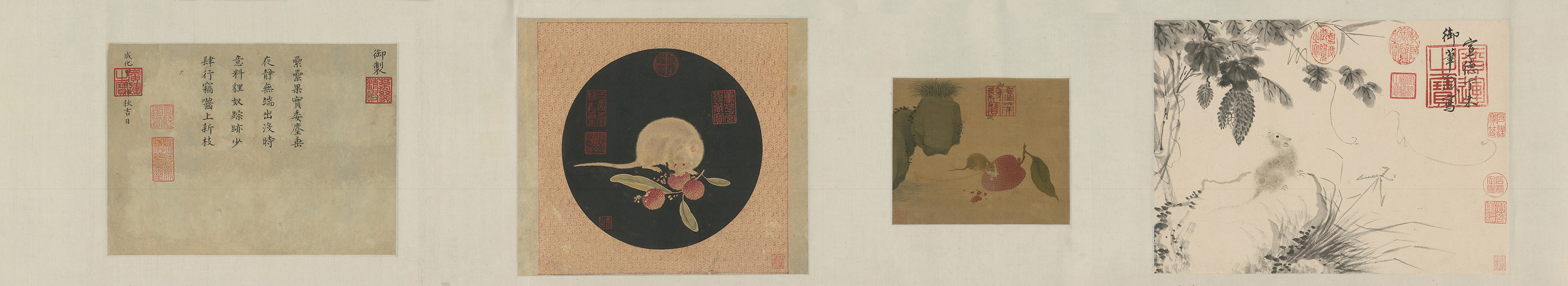 画卷由三件画作组成,分别为:苦瓜鼠图纸本墨笔、菖蒲鼠荔图绢本设色、食荔图。卷末有明宪宗朱见深御制题跋。