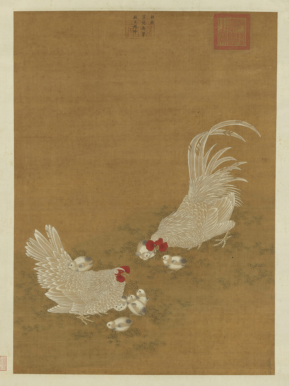 此图描绘平雌雄二鸡引雏觅食,亲情自然流露。明宣宗绘画多取材生活,宣扬伦理道德,具有教化功能。画鸡笔法工谨细腻,柔和勾线参以干笔皴擦,敷染白粉色彩,醒目突出,确有宋人工笔写生馀韵。画上署:「宣德御筆敕賜輔臣楊時」,并钤「物格致知」一印。查对宣宗字迹,显然非真,依其画风论,可能为明代中晚期院中画手所作。